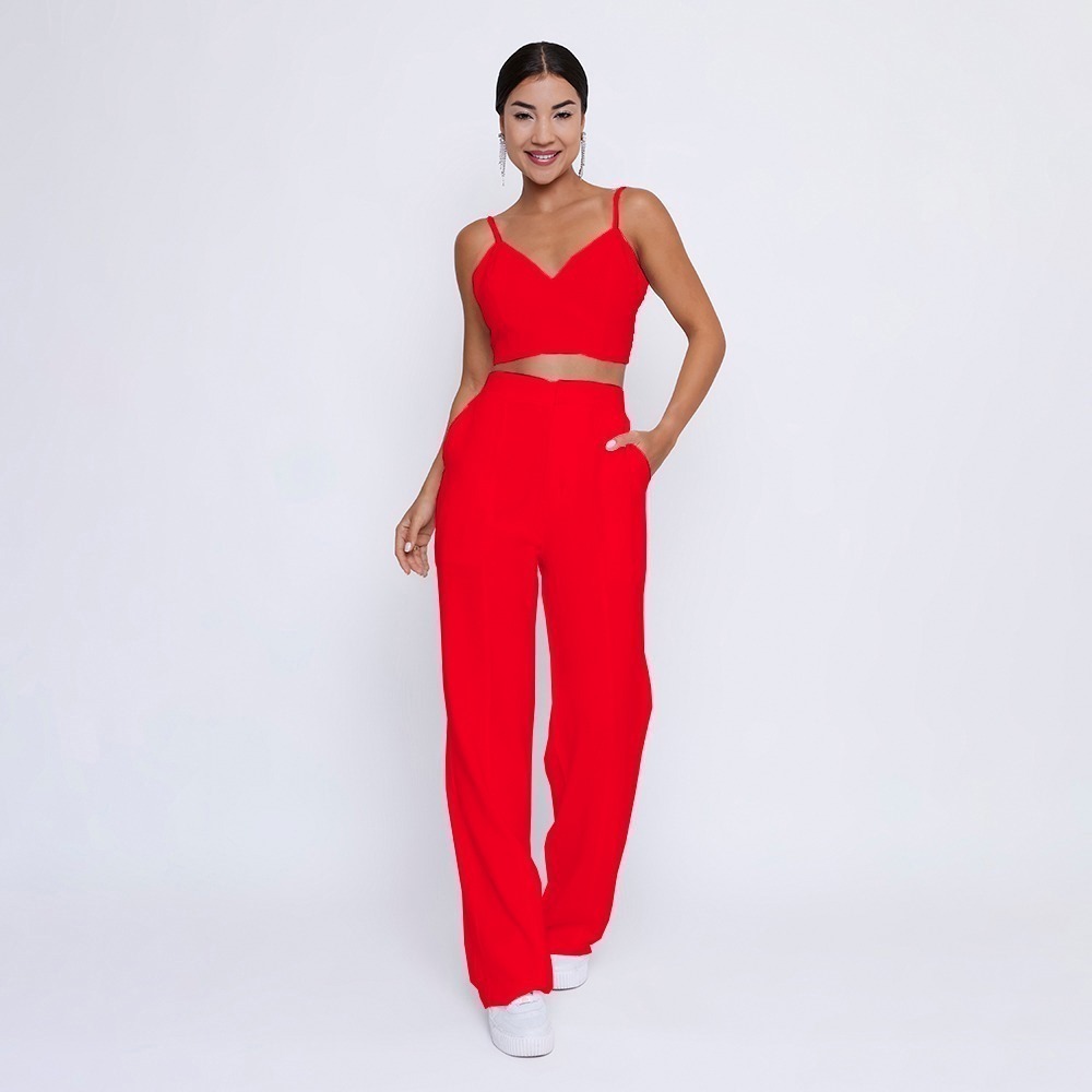 - Look Sofisticado para Sair: Use o top com a calça pantalona da mesma cor e tecido, adicionando saltos altos e acessórios delicados para um visual elegante e arrumado, perfeito para jantares ou eventos.